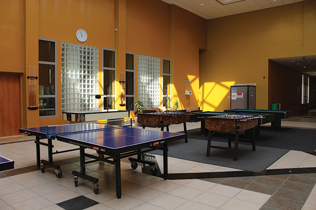 This indoor recreational area at Al Waha Club features billiard and table tennis tables, baby football and air hockey and a large screen TV. Several sofa corners and tables support also family & board games for young and old or supports public viewing of matches and sports events on a smaller scale.